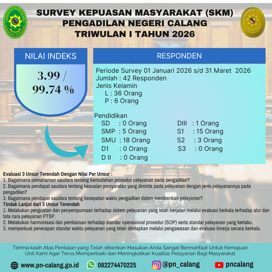 Bantu Kami Menjadi Lebih Baik Dengan Mengisi Survei Kepuasan Masyarakat (SKM) Layanan Pengadilan Negeri Calang dengan mengklik isi survey diatas